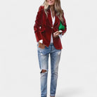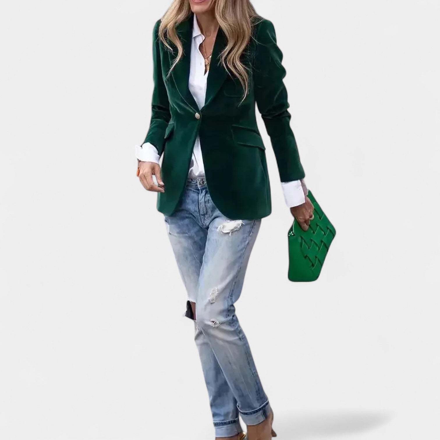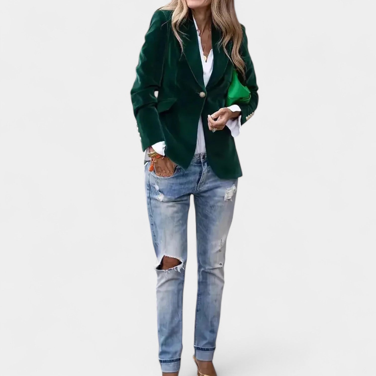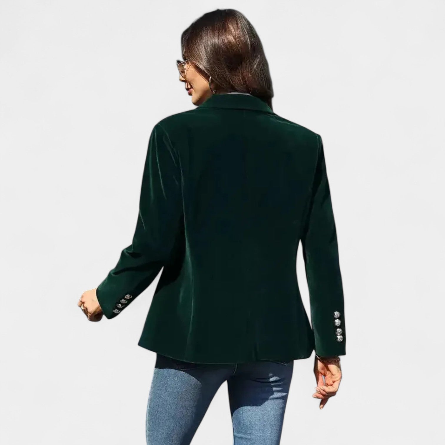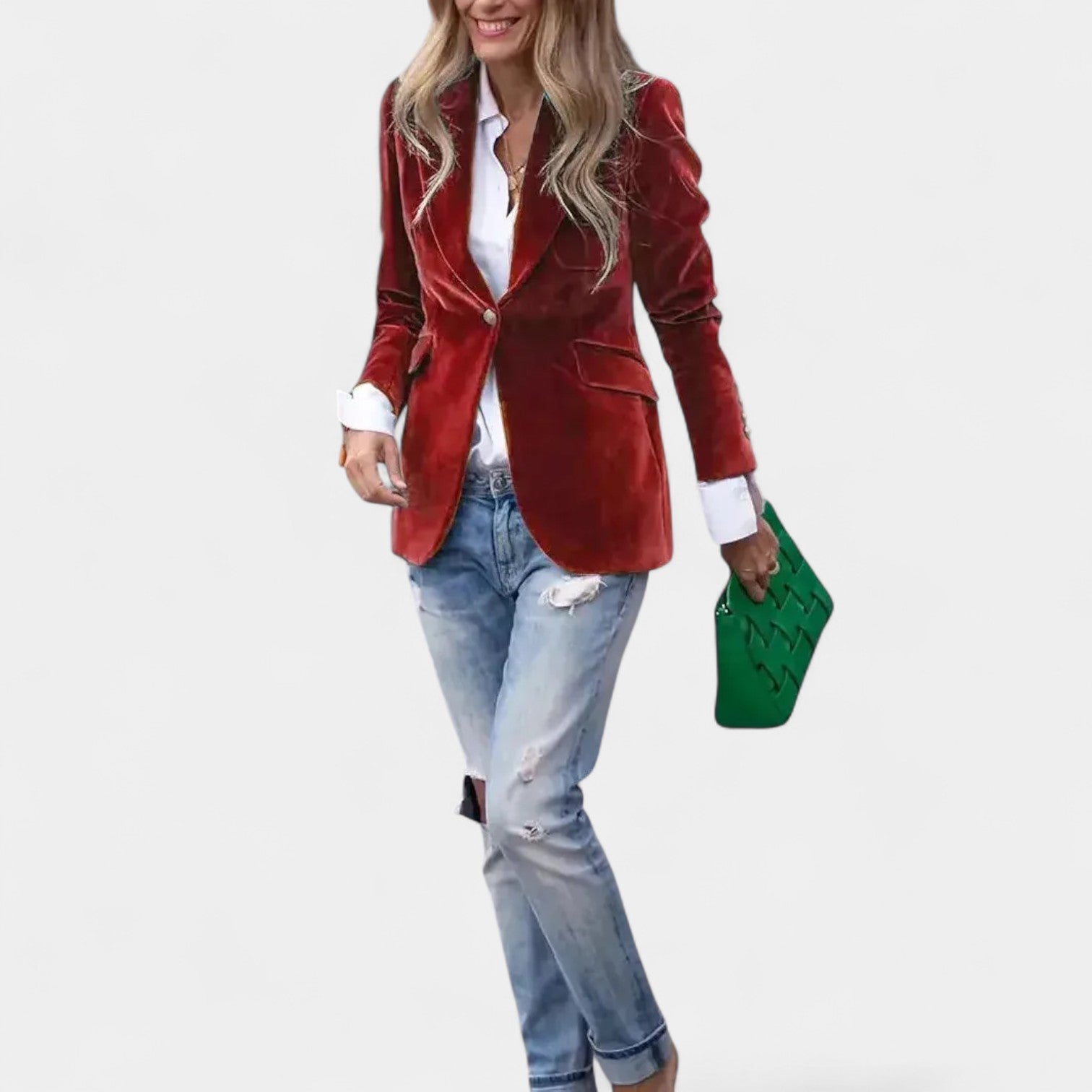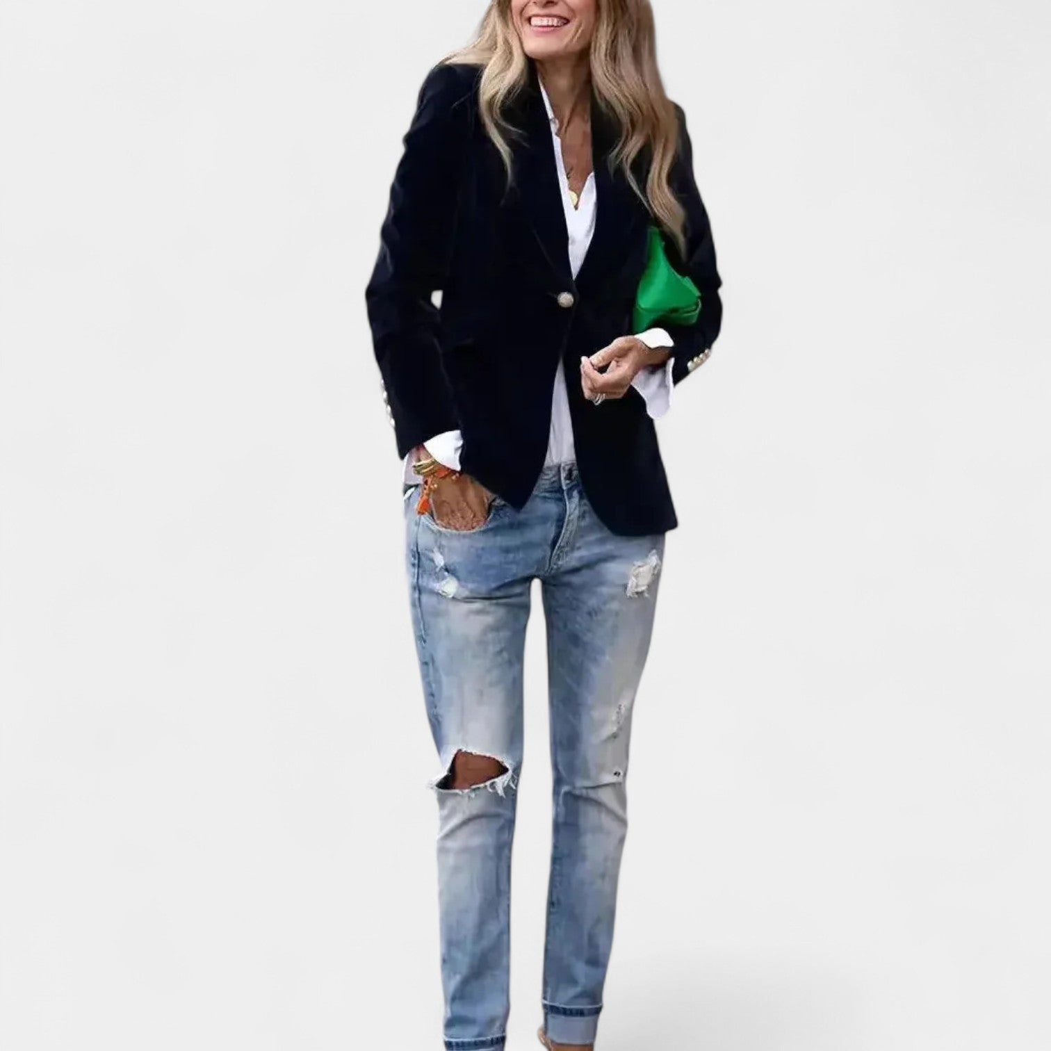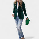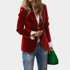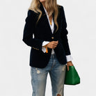Якето Andrea с меко кадифено покритие е перфектната дреха за жени, които искат да изглеждат елегантно и уверени във всяка ситуация. Благодарение на прецизната кройка с едноредно закопчаване, острите ревери и леко подсилените рамене, то създава ласкателен силует, който се съчетава добре както с дънки, така и с по-елегантни тоалети. Златните копчета на ръкавите добавят изтънчен детайл към цялостната визия.