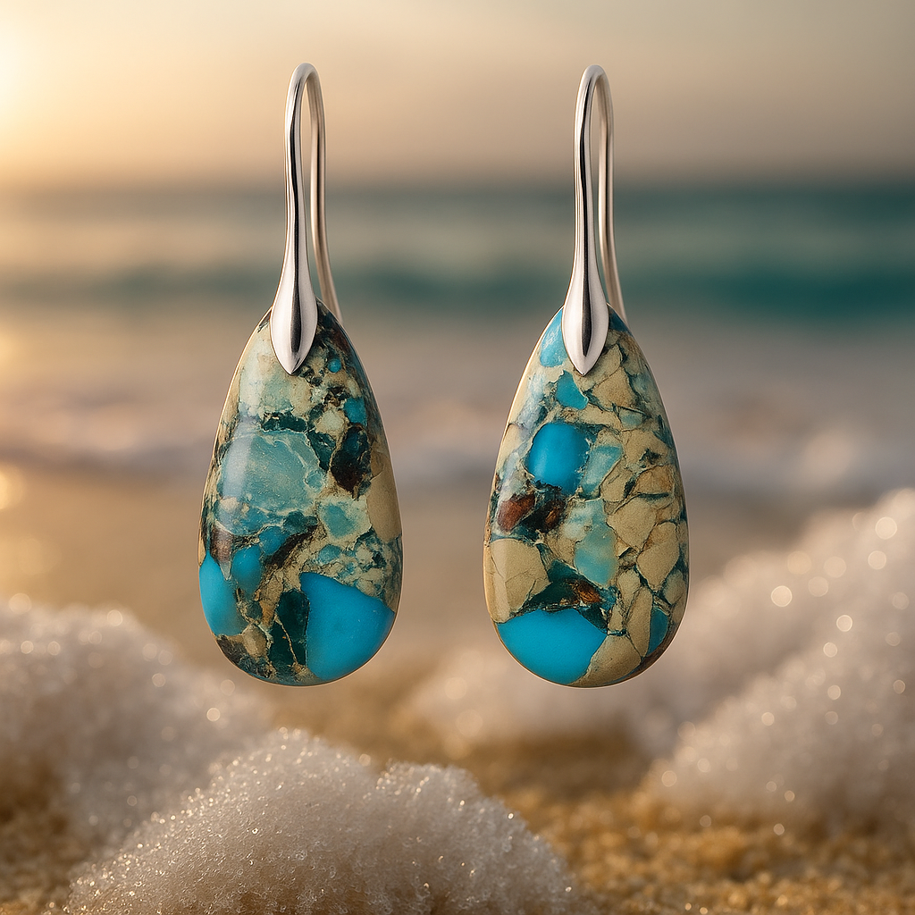 Обеците Orelia са вдъхновени от зашеметяващата красота на Биг Сур, където суровите скали се срещат с дълбокото синьо море. Тюркоазените камъни се съчетават перфектно със златисто-бежовите тонове на морската пяна на брега, създавайки композиция, която напомня за пейзажи от джунгла и чиста свобода.