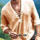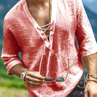 Zažijte letní pohodlí a styl s touto pánskou košilí z luxusního lnu. Udrží vás chladným a pohodlným po celý den. Volný střih a V- výstřih s tkaničkou nabízejí robustní šarm a jsou ideální pro jakoukoli volnočasovou aktivitu. Perfektní pro elegantní a univerzální garderobu.