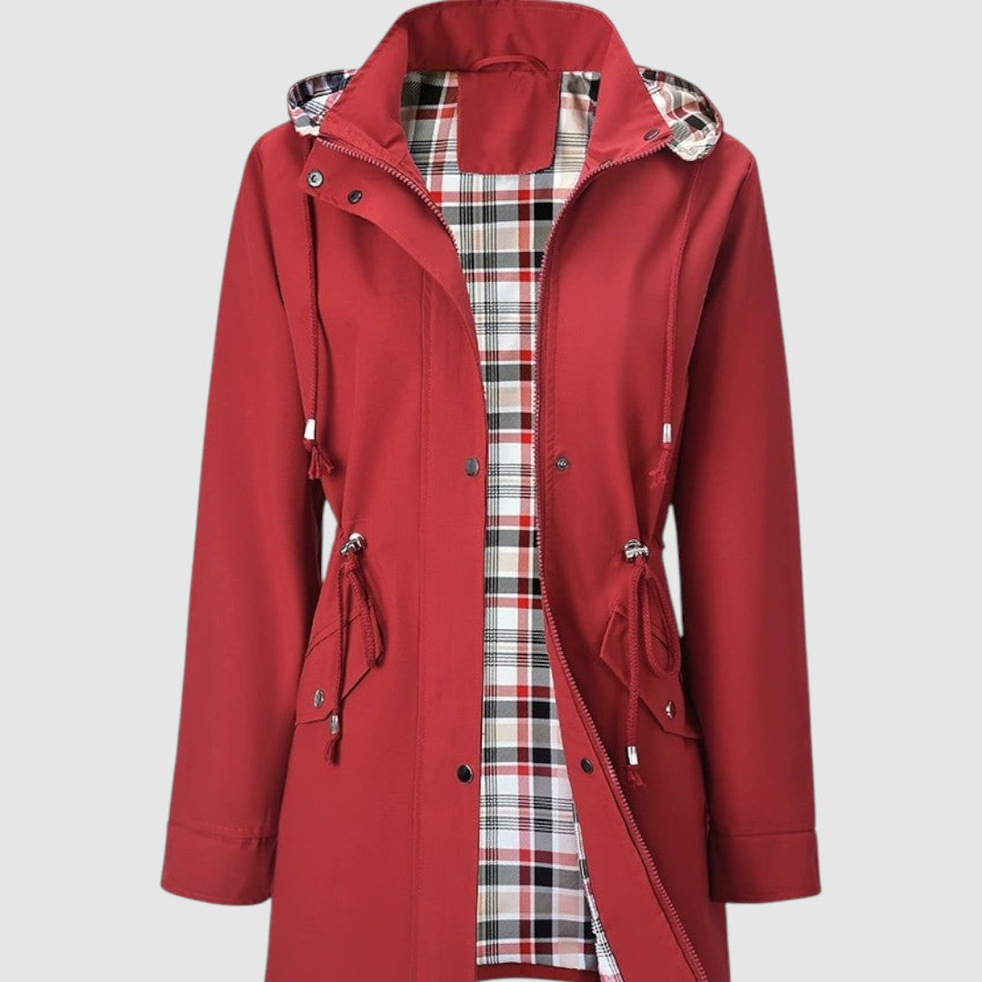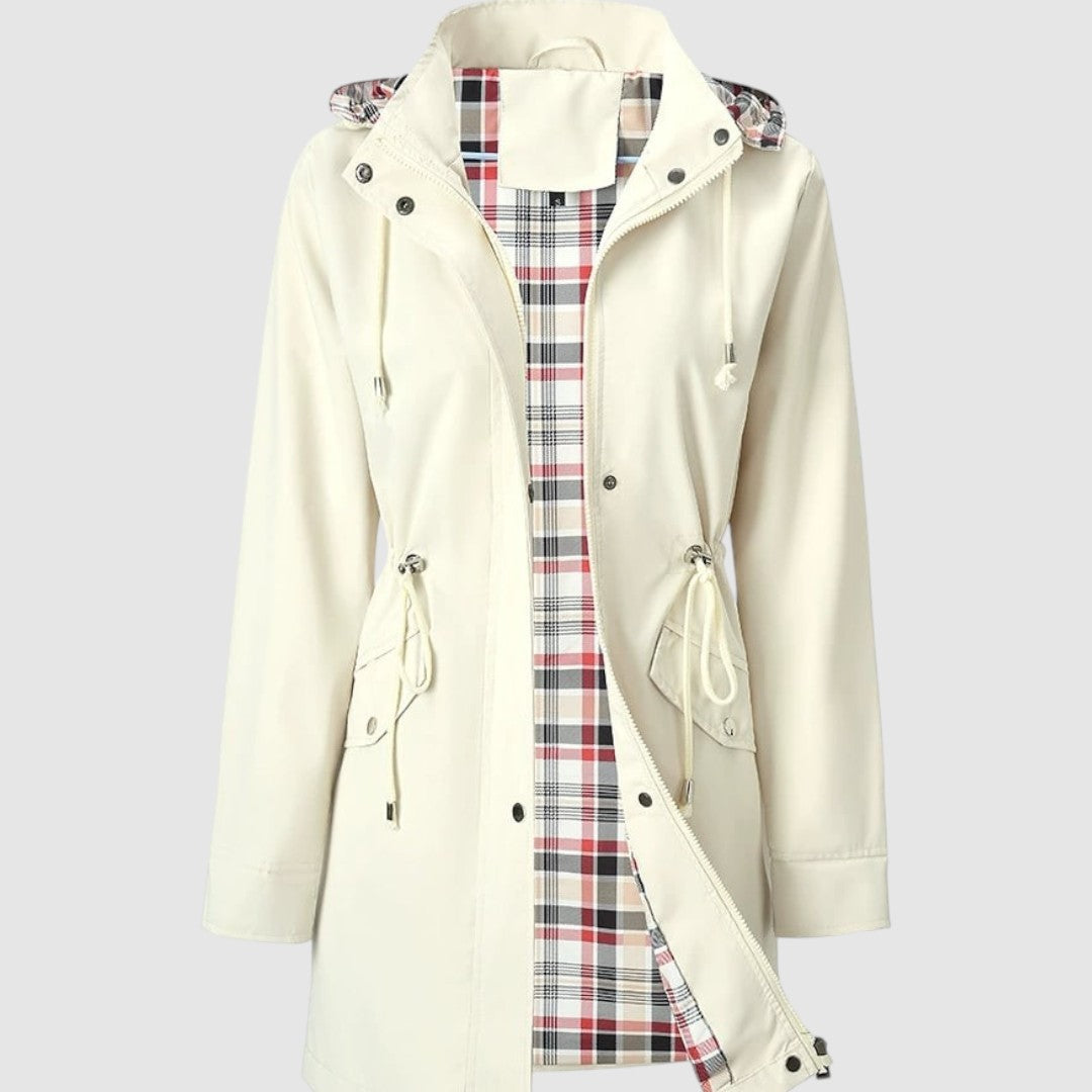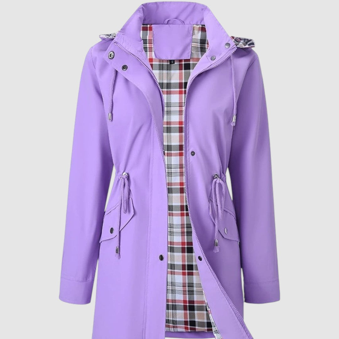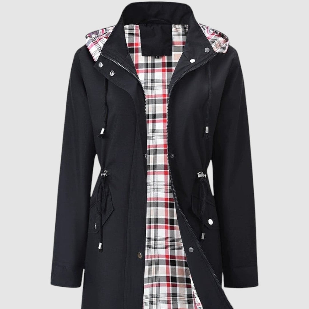 Това палто е перфектният избор за дъждовни и ветровити дни. Благодарение на водоустойчивия материал, то надеждно ще ви предпази от лошо време, а практичната качулка и връзката на талията добавят функционалност и женствен вид. Вътрешната подплата с кариран мотив осигурява комфорт и оригинален стил.